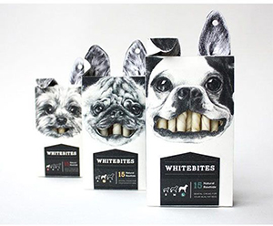? ? ??2. 這是一款以小狗的形象為主體的食品包裝,兩只耳朵增加了靈動性,還可以懸掛,最有創(chuàng)意的是里面的食物變成了小狗的牙齒,充滿了喜感。那么你有沒有看出來這其實就是狗糧的包裝呢?沒錯,雖然看起來像蛋卷,但它就是狗糧。可以看到下面的黑色圖形中印刷有三只小狗的剪影,分別標有 S/M/L ,這是狗糧所對應的狗的大小,十分形象又直觀,方便主人為寵物挑選。
