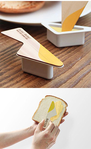 ? ? ? 5. 三角形的黃油包裝盒,盒蓋是刀子的形狀,開封后盒蓋實現(xiàn)了真正的刀的功能,不費力氣的就能把黃油抹在面包上,省去了清洗餐具的麻煩,真的是一款懶人必備的良物。